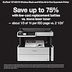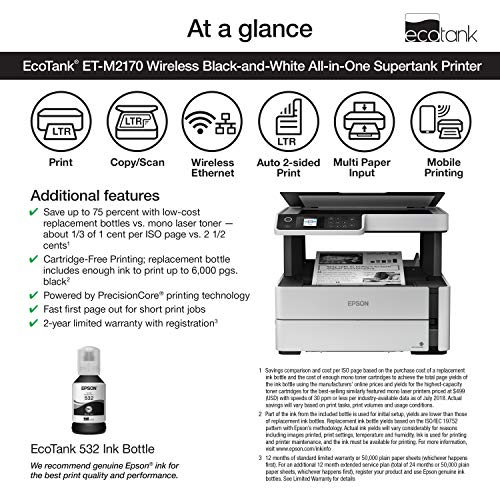 Equip your office with this Epson EcoTank multifunction supertank printer. The supersized ink tank supports cartridge-free refilling for easy maintenance, while the 2-sided printing and scanning maximize paper use. This Epson EcoTank multifunction supertank printer features PrecisionCore printing technology for brilliant text and images, while print speeds of up to 20 pages per minute and a 250-page paper tray meet the needs of small businesses. Built-in wired and wireless connectivity for convenience. Prints up to 20 pages per minute (ppm) (ISO) in black. Up to 1200 x 2400 dpi resolution for clear text. Copies up to 17 ipm in black. Flatbed color scanner with resolutions up to 1200 x 2400 dpi.